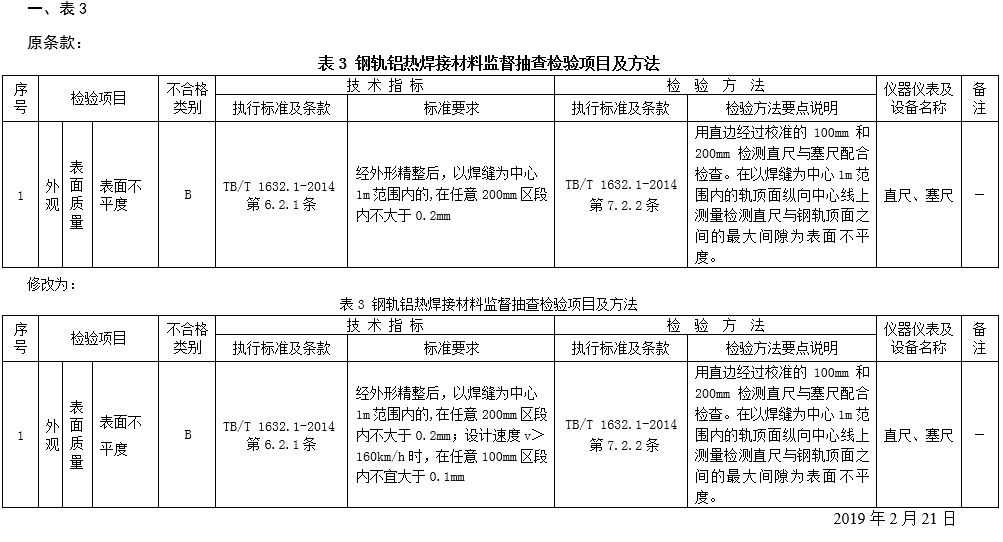 《钢轨铝热焊接材料-铁路专用产品质量监督抽查检验实施细则》(GTCC-076-2018)更正内容
