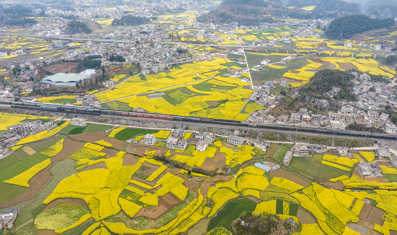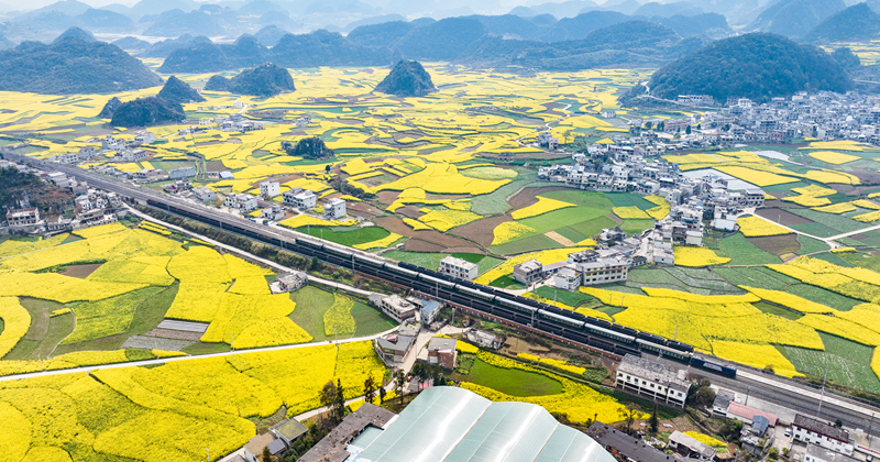 仲春时节,贵州省多地油菜花竞相绽放。一趟趟列车在油菜花海之中穿行,勾勒出黔贵大地朝气蓬勃的春日景象。