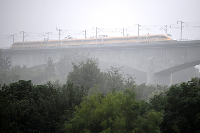 联调联试综合检测列车驶过位于陕西省西安市的西延高铁渭河特大桥。