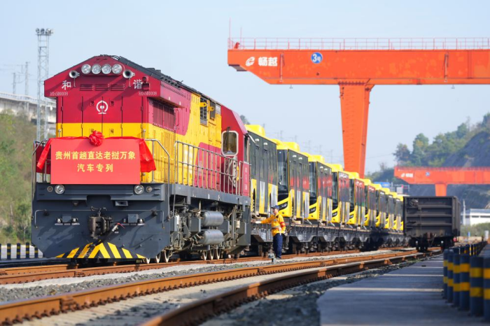 10月底,55台“贵州造”新能源客车搭乘西部陆海新通道国际铁路联运班列,从贵阳国际陆港都拉营站开出,不久后抵达老挝万象。