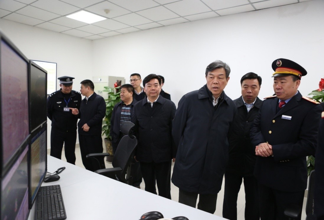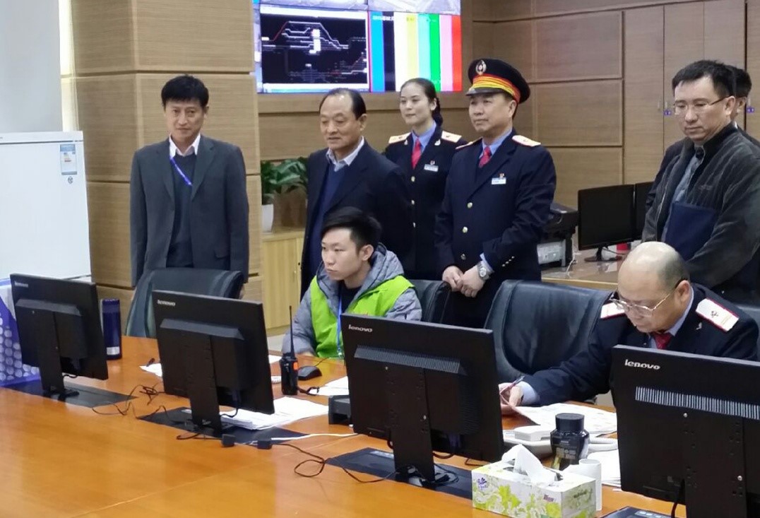 图为局党组成员、副局长陈兰华(左2)在广州站综合指挥中心检查春运工作。