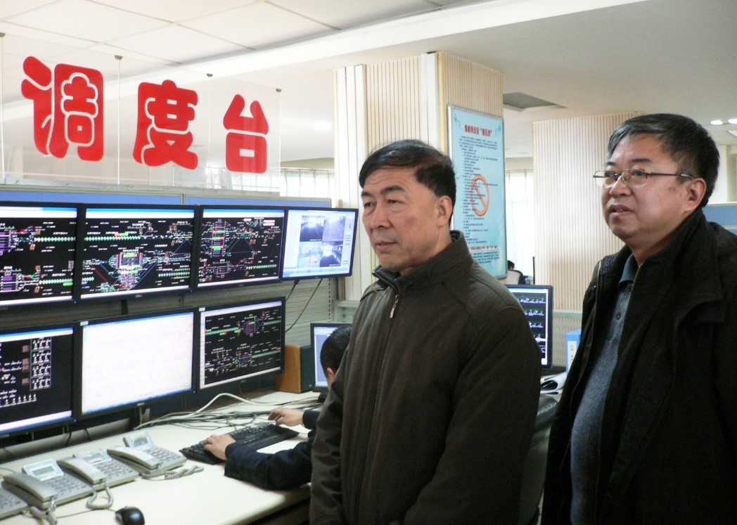 图为局党组成员、副局长傅选义(右2)在郑州铁路局调度所检查春运工作。