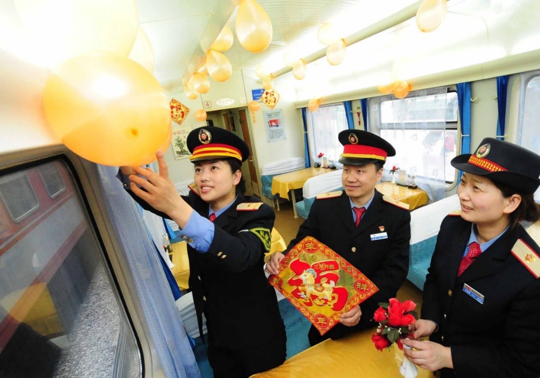 烟台至北京的K286次列车出发前,列车长带领乘务员布置车厢,营造喜庆的节日气氛。
