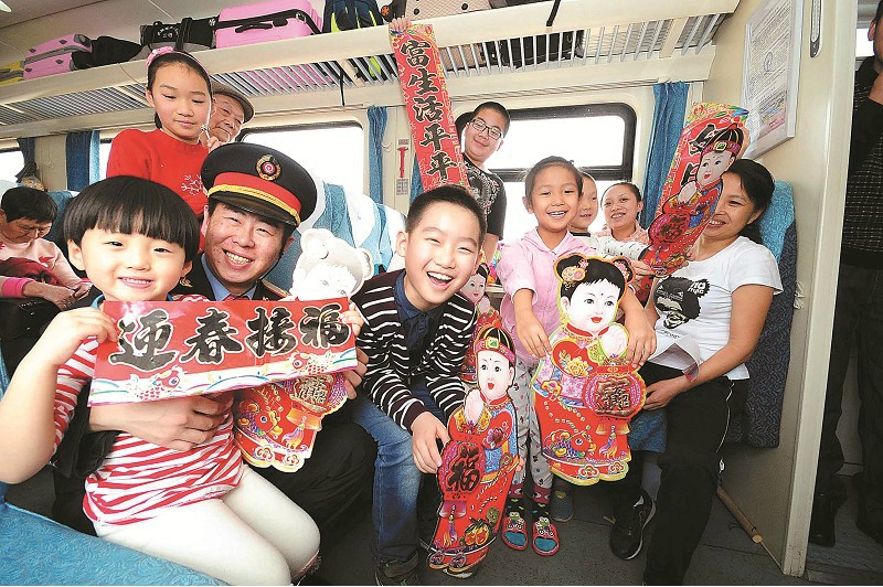 在哈尔滨开往??诘腪114次列车上,列车工作人员开展为旅客送春联、与旅客互动表演活动,给旅客送上新春的祝福和家的温馨,让返乡过年的旅客感受新春的喜庆。刘一赢 摄
