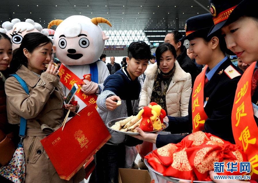 郑州东站工作人员在候车大厅,为旅客派送麻糖、春联、福袋等新年礼物,愿乘客带“?!背鲂?。图片来源:新华社