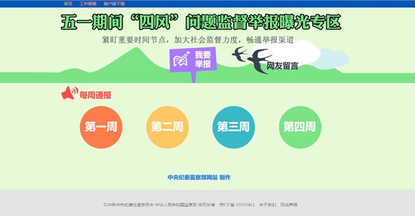 为贯彻落实十八届中央纪委第五次全会精神,继续抓好重要时间节点,紧盯“四风”新形式、新动向,畅通举报渠道,加大监督力度,中央纪委监察部网站推出《五一期间“四风”问题监督举报曝光专区》?!懊恐芡ūā崩改拷?月20日起,每周对各级纪检监察机关查处的违反中央八项规定精神案件进行点名道姓通报曝光。专区还设有网友留言区,欢迎广大网友就“四风”问题治理等建言献策。