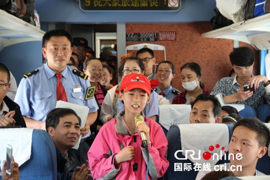 图为一位来日喀则旅游小旅客为大家演唱《喜欢你》博得了全车人的热烈掌声和欢呼声。(图片来源:国际在线)
