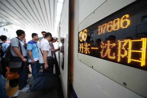 图为旅客在丹东站登上首发动车组列车。