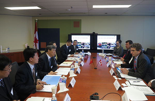 当地时间4月16日至23日,国家铁路局局长陆东福应邀率团访问加拿大、美国。访问期间,分别与加拿大交通部副部长迈克尔˙基南,加拿大运输署、加拿大运输安全委员会等单位负责人举行了会谈;与美国联邦铁路署署长萨拉˙范博格共同主持了铁路工作组会议。中方系统介绍了中国铁路规划、建设和运营情况以及中国高速铁路发展成就和优势,就铁路改革发展、行业监管、市场化运营、高速铁路合作以及推动铁路合作交流机制化建设等问题与外方深入交换了意见。中国驻加拿大使馆、驻美国使馆有关人员参加了会议。陆东福一行还到加拿大国家研究理事会、加拿大铁路客运公司、加拿大国家铁路公司、加拿大温哥华太平洋中央车站、加拿大蒙特利尔至渥太华客运列车以及美国联合太平洋铁路公司芝加哥货运枢纽等地考察调研。图为陆东福局长(左三)与加拿大交通部副部长迈克尔˙基南(右一)会谈。
