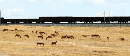 青藏铁路列车行驶在藏北草原上,以桥代路有效地?;ち烁咴?新华社记者 普布扎西 摄