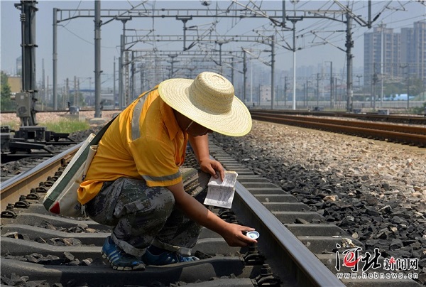 每当气温达到35℃以上,北京铁路局石家庄工务段的巡热工就要徒步巡查在高温状态下铁轨是否出现胀轨跑道等不安全隐患。图为巡热工在查看轨温表。(图片来源:河北新闻网)