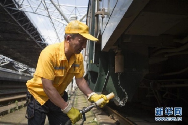 上海南站,一名铁路工人在烈日下为列车加注清水。(图片来源:新华网)
