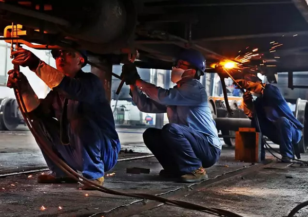 南京东车辆段职工按标作业、精检细修。(图片来源:上海铁路局)