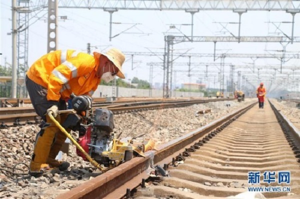京沪铁路沿线的晏城站,济南铁路局济南工务段的铁路焊轨工在高温下作业。(图片来源:新华网)