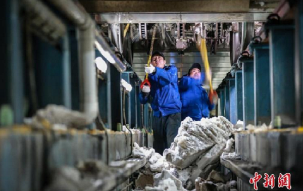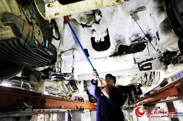 由于气温较低,京广线、京沪线上的高铁列车在快速运行中底部产生大量积雪冻冰。降雪后北京动车段配属动车组车底结冰严重,动车组在日常检修有序进行的同时,又成立了打冰除雪应急小组,清理列车底的积雪,确保动车组准时出库。(来源:中新网)