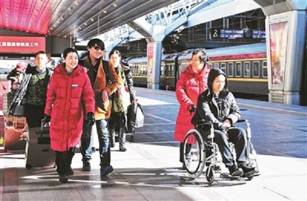 “看这气色真好,身体恢复了?过了春运我就退休了,今天我送您上车……”2018年春运,对于全国老劳模、北京站客运员李素萍来说很特殊,这是她入路30多年的最后一个春运。30多年来,她在短短的候车室与站台间留下了近20万公里的脚步,轮椅推坏142把,细心呵护迎来送往老弱病残旅客不计其数;以她名字命名的“素萍服务组”,成为北京站的金字招牌。图为李素萍(右二)和“素萍服务组”的年轻成员一起,将需要帮助的旅客送至站台。(来源:北京青年报)