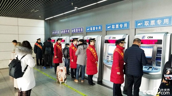 天津西站配备专职人员帮助旅客解决取票过程中遇到的困难。(来源:央视网)