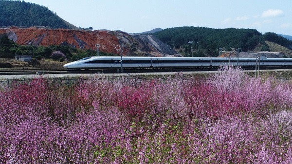 在贵州省凯里市,铁路旁边春花开放,动车组列车行驶在芬芳中。吴吉斌 摄