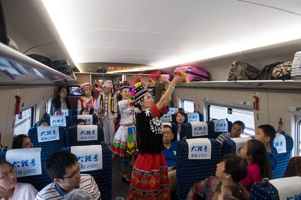 图为乘务员身着民族服饰在车厢内表演舞蹈。