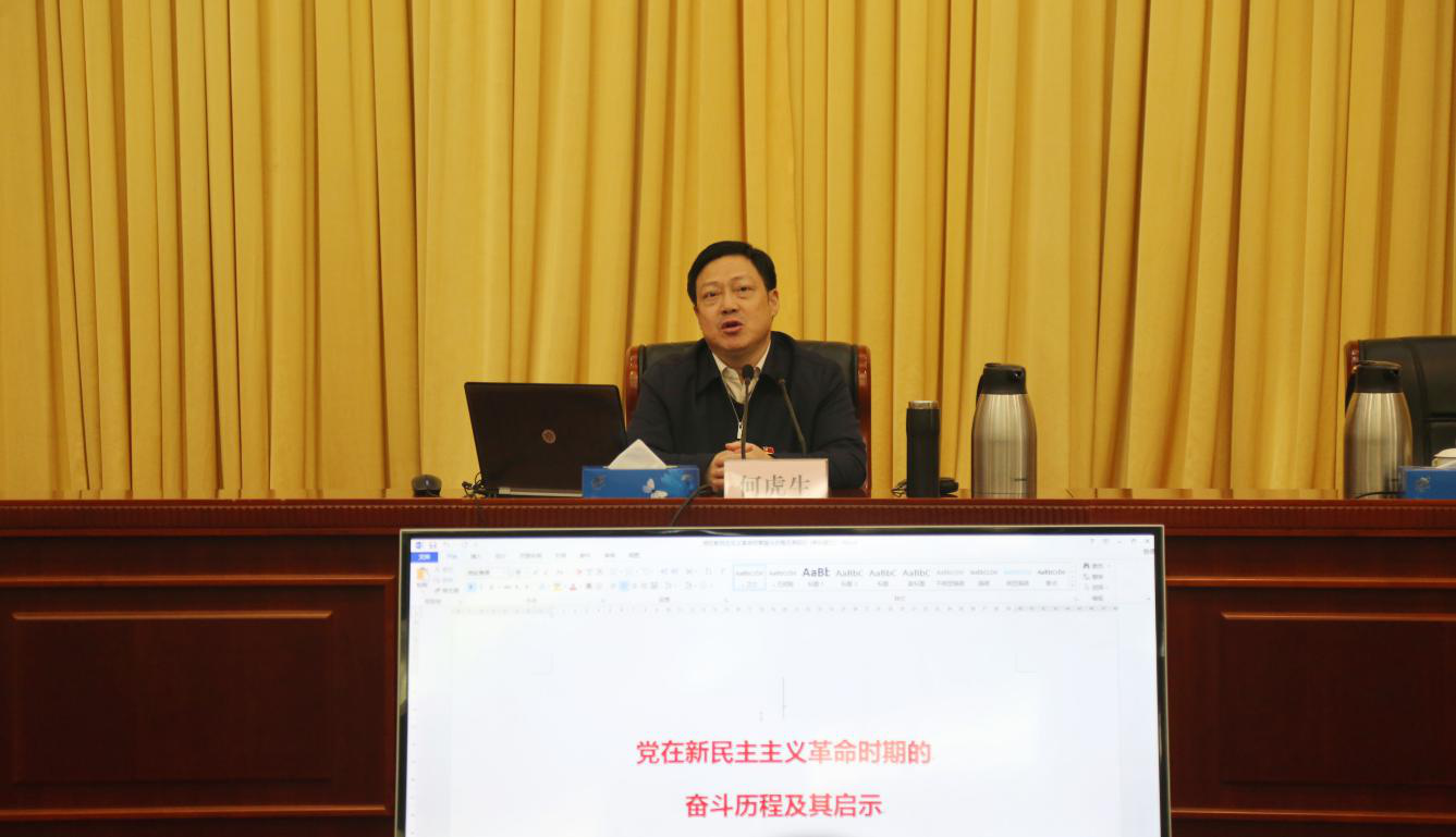 培训班还邀请中国人民大学马克思主义学院教授何虎生同志作“党在新民主主义革命时期的奋斗历程及其启示”的专题辅导讲座。何虎生同志重点围绕“中国共产党的诞生”、“投身大革命的洪流”、“中国革命新道路的开辟”、“全民族抗战的中流砥柱”、“夺取新民主主义的全国性胜利”等方面,深入分析了党在新民主主义革命时期奋斗的历史启示,阐述了革命胜利的原因、基本经验和历史意义,为全体党员干部更好认识理解和把握党在新民主主义时期的历史,从思想深处感悟党的初心使命,开阔了思路、深化了认识。