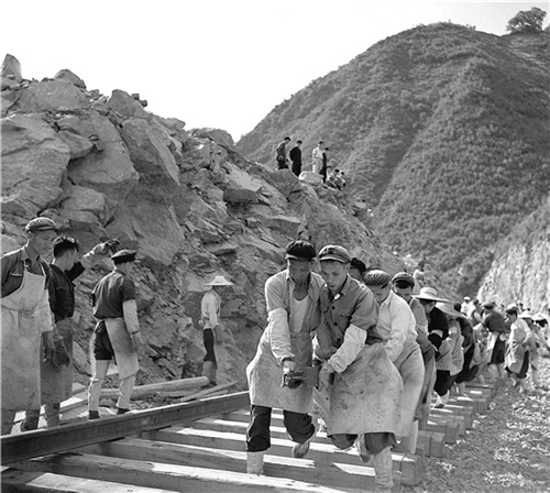 1955年,宝成铁路建设者在紧张地铺轨。
