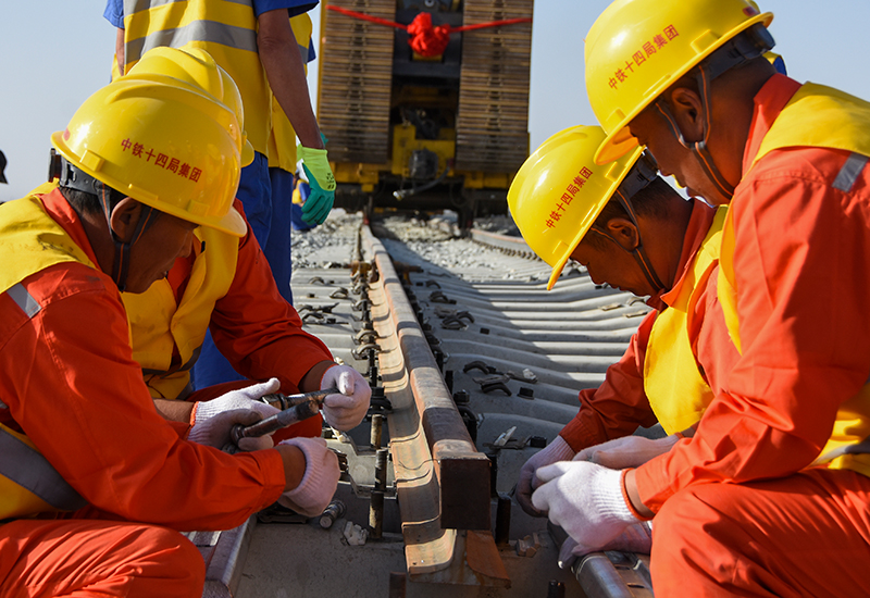 中铁十四局工人正准备将钢轨合龙。