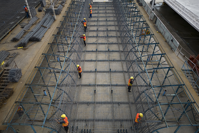 工人在哈伊高铁铁伊段先行工程跨S207省道2号特大桥