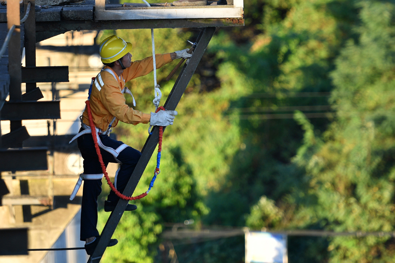 桥隧工在沪昆铁路新舞水钢梁桥准备巡检作业。