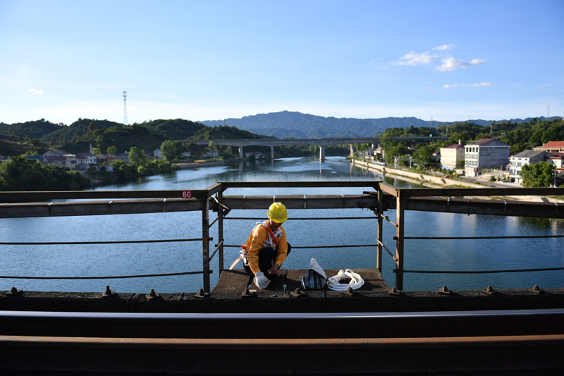 桥隧工在沪昆铁路新舞水钢梁桥巡检作业。