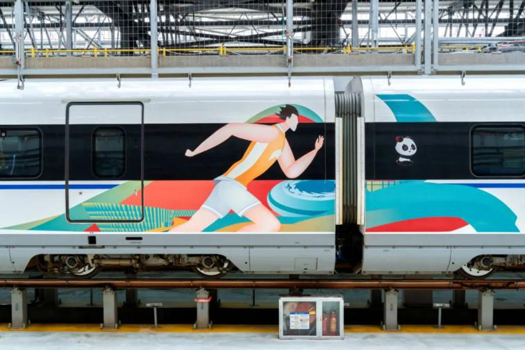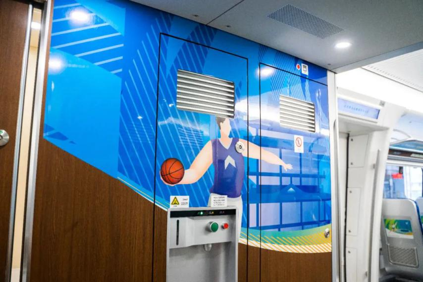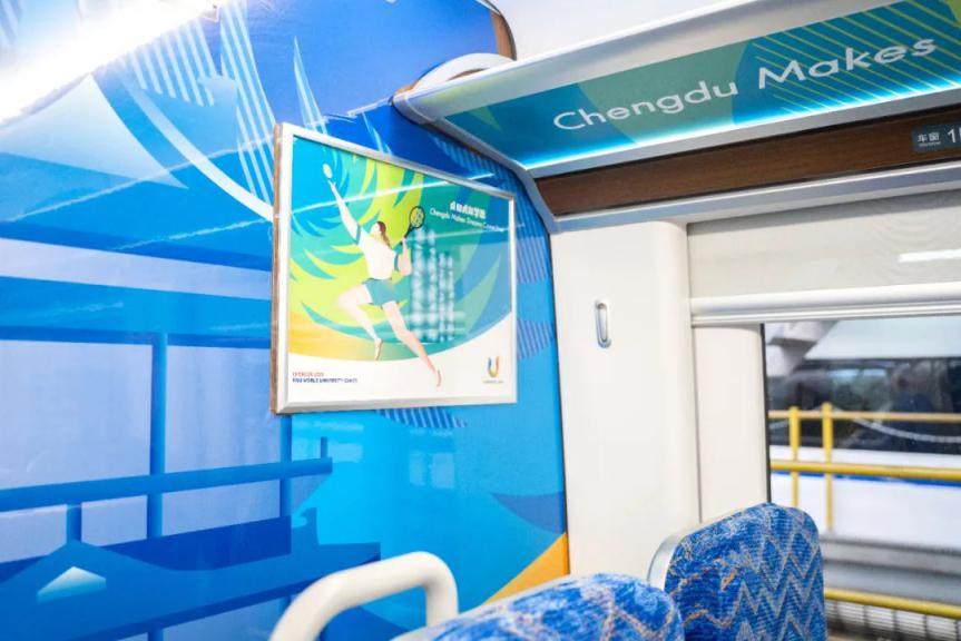 列车采用大运会元素涂装,彰显成都青春靓丽迎大运的风采。外观是大熊猫和运动健儿奔跑的卡通形象,活力四射、充满动感;内部选用清爽的深蓝底色,车门贴、行李架装饰贴、头巾片上有许多奔跑、挥拍、投篮的形象,色彩明快、格外醒目。此次大运会期间共有两组“大运号”旅游主题列车在成渝高铁和成都市域环线亮相运行。
