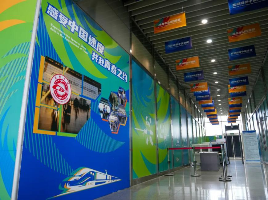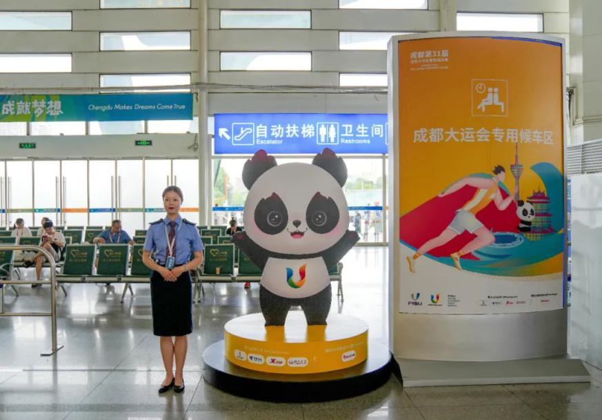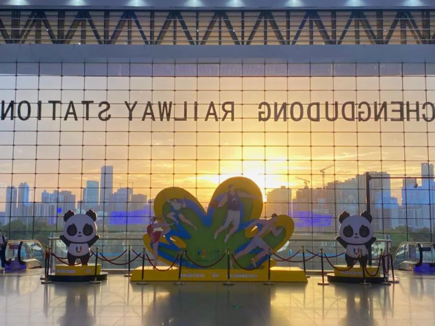 作为成都大运会官方抵离服务点的成都东站,以“感受中国速度、共赴青春之约”为主题,利用大运会主视觉体系为基底、吉祥物“蓉宝”等元素为重点打造大运会主题车站。在北进站口东侧开辟大运会专用通道,方便抵离客群快速进入车站;打造大运会专用候车区,候车区内设置有抵离服务台,提供茶点、充电宝、饮用水等,为抵离客群提供更加优质的服务保障;设置大运会吉祥物造型、大运会打卡点等?;啡氐厍某啥级⒊啥嘉?、成都南、双流机场、新都东等多个车站还进行了环境卫生改善及铁路沿线环境整治,努力创造美好温馨的乘车环境。