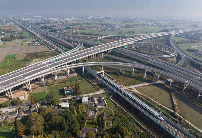 11月28日,首发列车C6008次列车行驶在川青铁路上,该段与成万高速并行、与成都都市圈环线高速交会。
