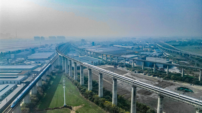 11月28日,在成都市青白江区境内拍摄的行驶在川青铁路上的列车(上)和行驶在西成高铁线上的列车(下)。