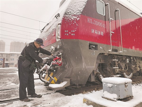 12月11日,济南机务段组织技术骨干冒雪对出入库机车进行质量检查,确?;底刺己?。