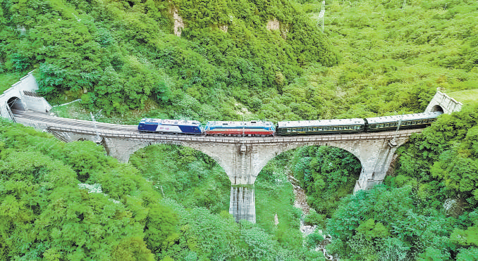 从四川省广元市开往陕西省宝鸡市的6064次慢火车,行驶在宝成铁路松树坡铁路桥上,旁边是郁郁葱葱的林海。