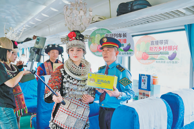 从贵州省玉屏侗族自治县开往贵阳市的5639次慢火车列车长胡贵川(右一),尝试用网络直播的方式帮助老乡们带货。