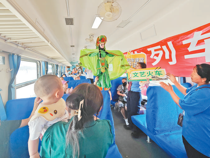 在四川省攀枝花市开往凉山彝族自治州越西县普雄的5634次慢火车上,车厢中开展非物质文化遗产普及活动。