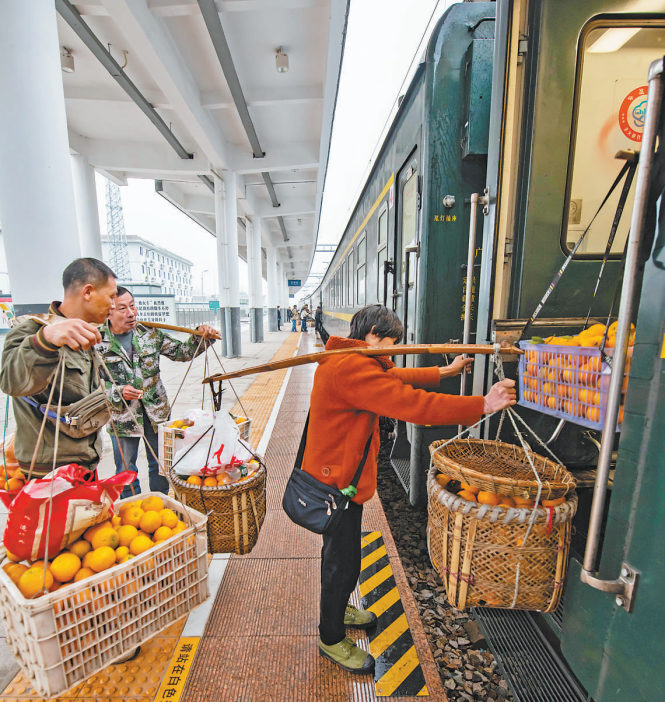 从湖南省怀化市开往重庆市秀山土家族苗族自治县梅江的7272次慢火车??吭诤鲜÷檠裘缱遄灾蜗亟鹾驼?,村民挑着当地特产冰糖柑登上列车,运往贵州省铜仁市销售。
