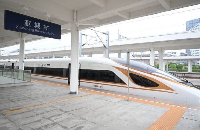 宣绩高铁首趟试运行列车在宣城站准备发车。