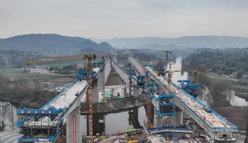 成渝地区双城经济圈建设五年来,川渝两地间的铁路交通“大动脉”建设快速推进。眼下,连接川渝两地的成渝中线、成达万和西渝高铁康渝段三条高铁建设正酣,施工单位努力抢工期、抓进度。三条高速铁路建成通车后,将进一步压缩成渝城市群时空距离,极大便利沿线旅客出行,助力成渝地区双城经济圈发展提质增速。