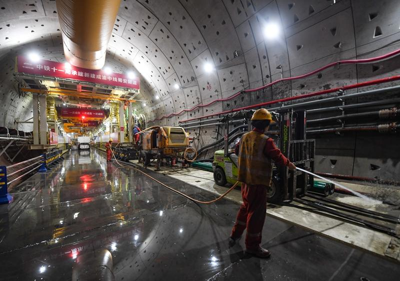 工人在位于四川省成都市的成渝中线高铁蜀安隧道进行隧道泵浆作业。