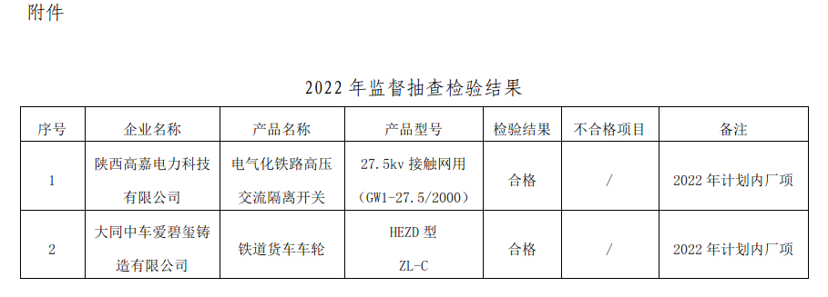 本批抽查2种产品2个厂项,合格2个,不合格0个。按产品分类,供电类产品1个厂项,车辆类产品1个厂项。